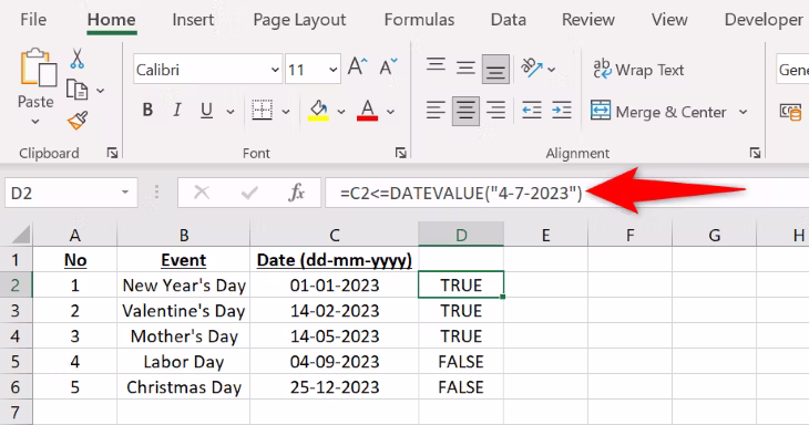 如果单元格的日期在 2023 年 7 月 4 日或之前,则公式将返回 TRUE 结果。但是,如果您的日期在 2023 年 7 月 4 日之后,那么您的单元格中将得到 FALSE 结果。