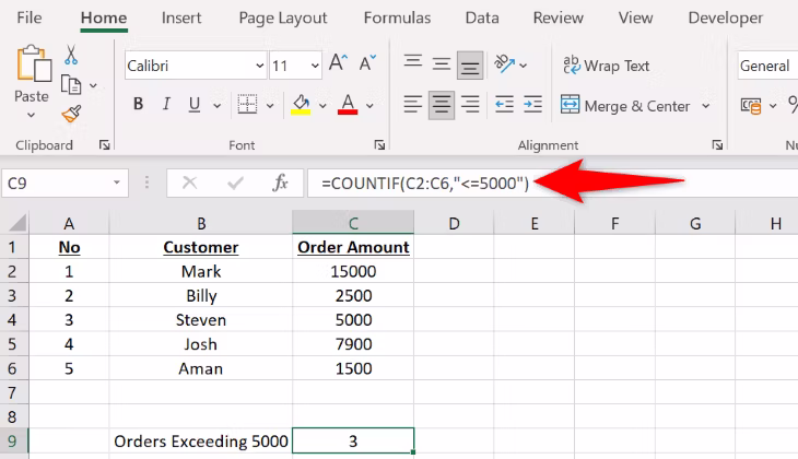 =COUNTIF(C2:C6,"<=5000")
