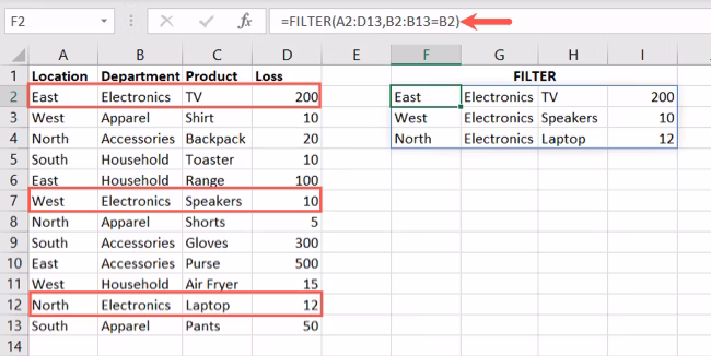 =FILTER(A2:D13,B2:B13="Electronics")
