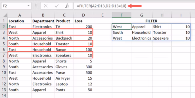 =FILTER(A2:D13,D2:D13=10)