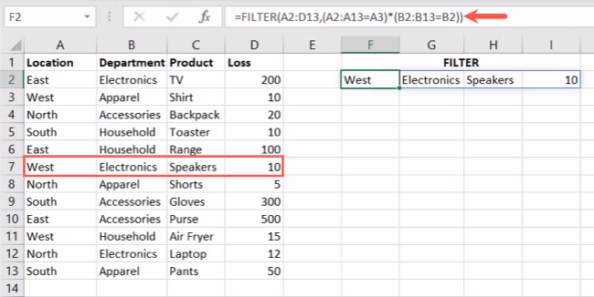 例如,我们将使用星号 (*) 和以下公式按 A3(西部)和 B2(电子)过滤我们的数据集: