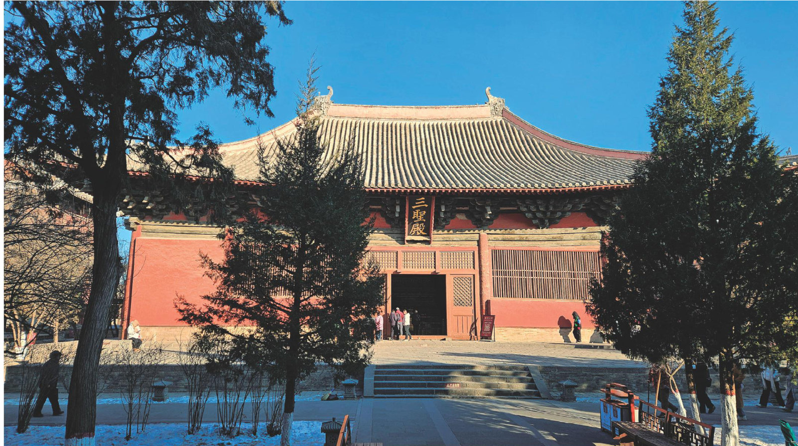 三圣殿建于金代,是善化寺的重要建筑之一,与山门同期修建,位于大雄宝殿之前、山门之后。殿内供奉着释迦牟尼佛、文殊菩萨、普贤菩萨三尊塑像。三圣殿整体延续了
