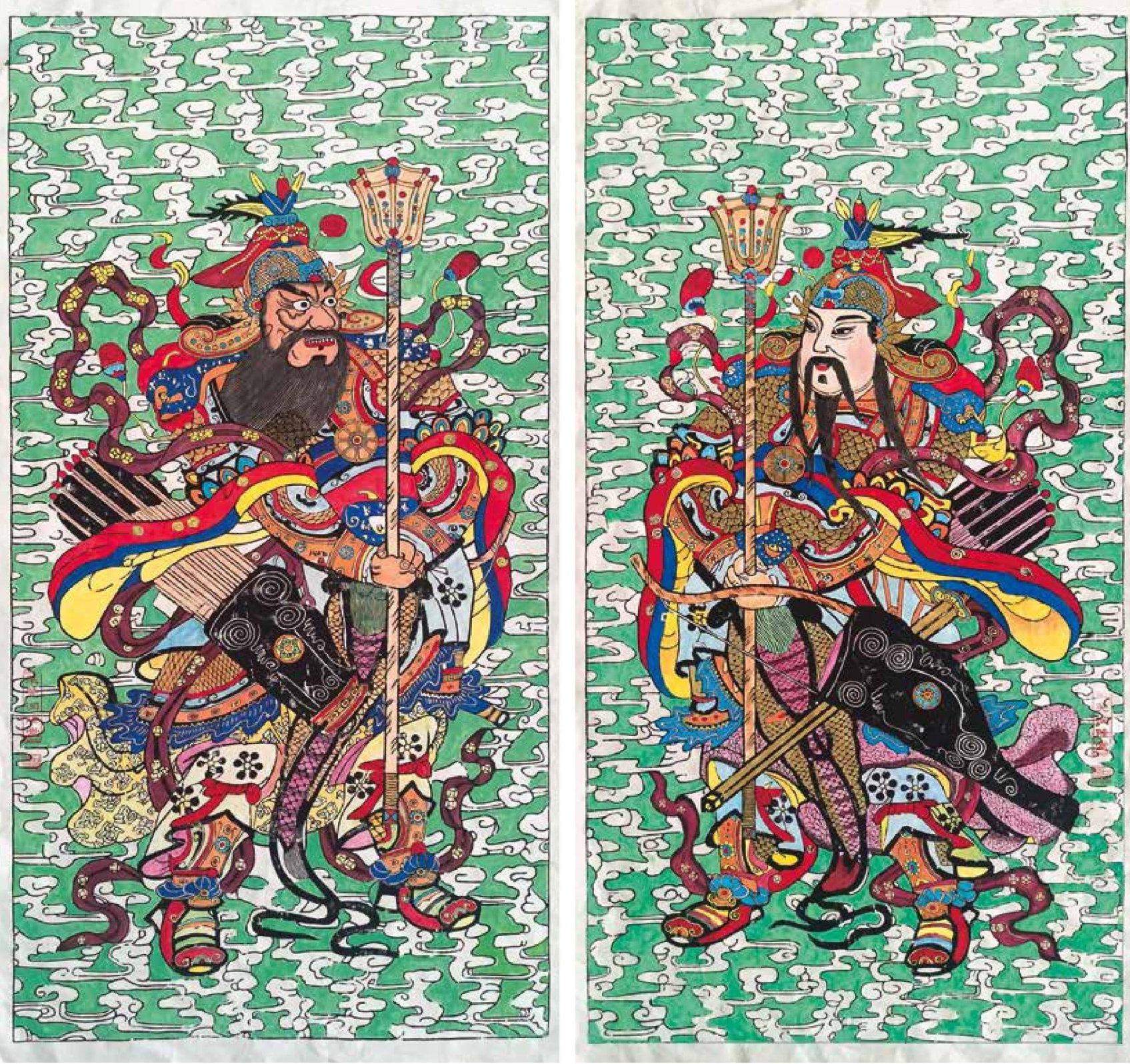 石桂利木刻《绿云门神秦琼、敬德》,高136cm,宽66cm,线版刻制,手工填色