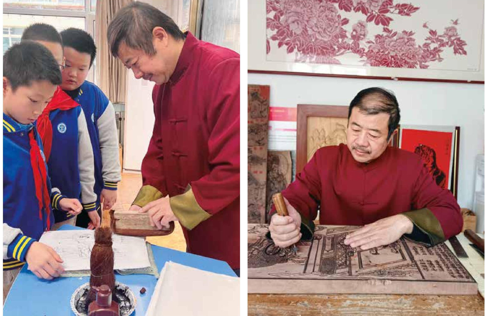左:石桂利到学校教授孩子们印制木版年画 右:石桂利在刻版