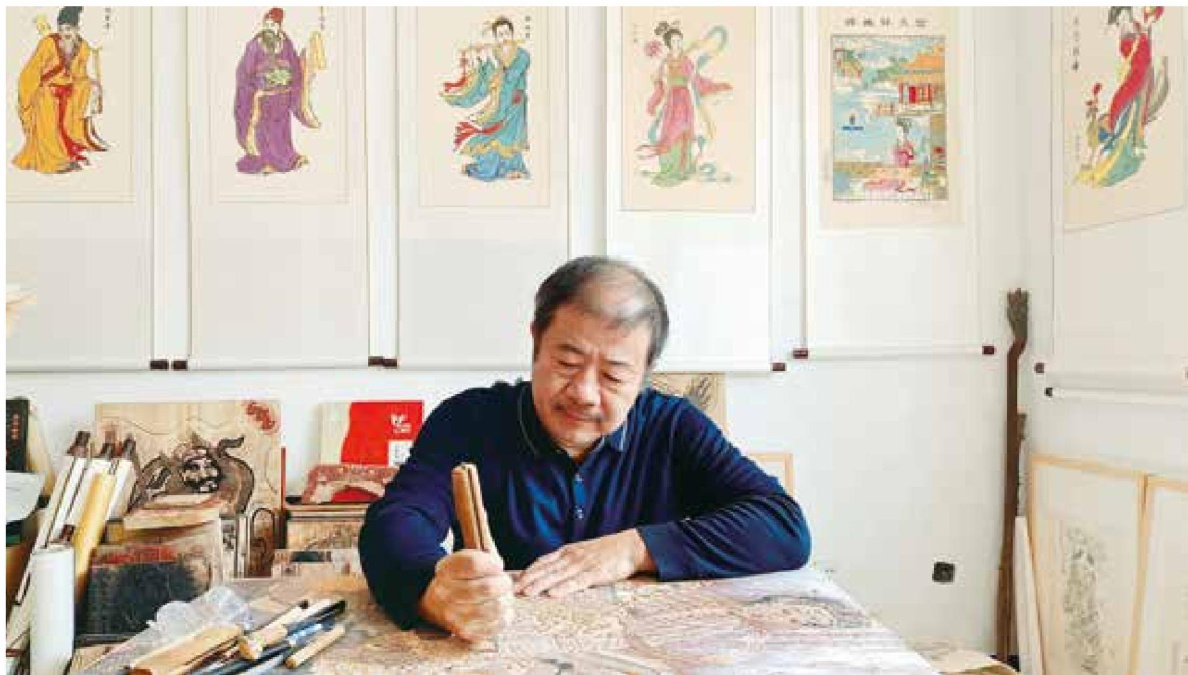 石桂利在刻制木版年画《麻姑献寿》
