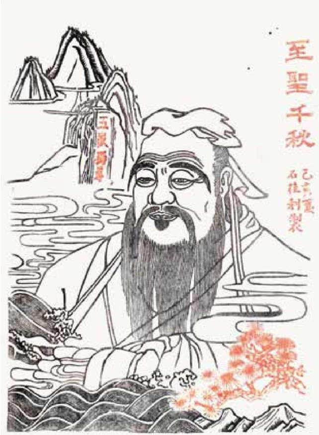 《至圣千秋》高66cm,宽46cm,2019年在山东艺术学院参加年画艺术培训班时和同组几个同学共同设计图稿,石桂利刻制创作的作品,又名《一山一水一圣人》,主要是为了宣传山东的人文胜景