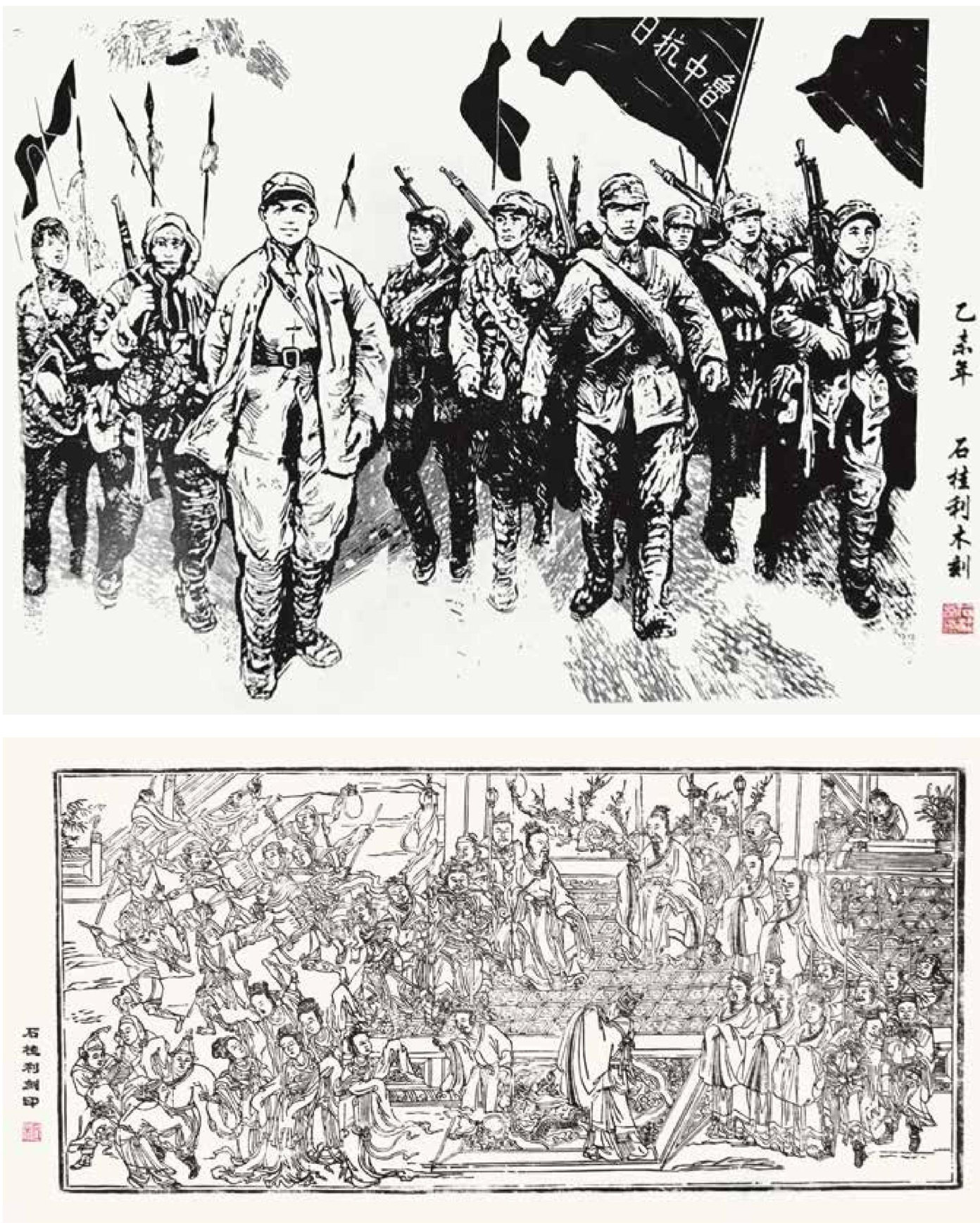 上:《鲁中抗日》高3m,宽3m,2015年为抗日战争胜利70周年创作 下:孔子圣沈图之一《夹谷会型》印制图