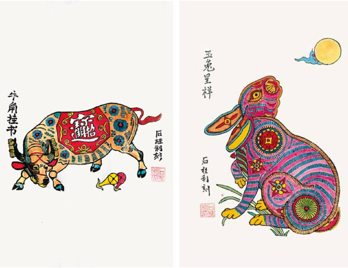左:《牛角挂书》高46cm,宽cm,2021年刻。根据成语故事牛角挂书创作,寓意年青人要勤奇读书,学好知识,将来才能更好地建设祖国,回报父母 右:《玉免呈洋》高46cm,宽3cm,2023年免年例作。挥中国传统吉祥阳案,添加在兔子身上,以红色为主色,寓意祝福人们免年吉祥如意,事业红红火火。