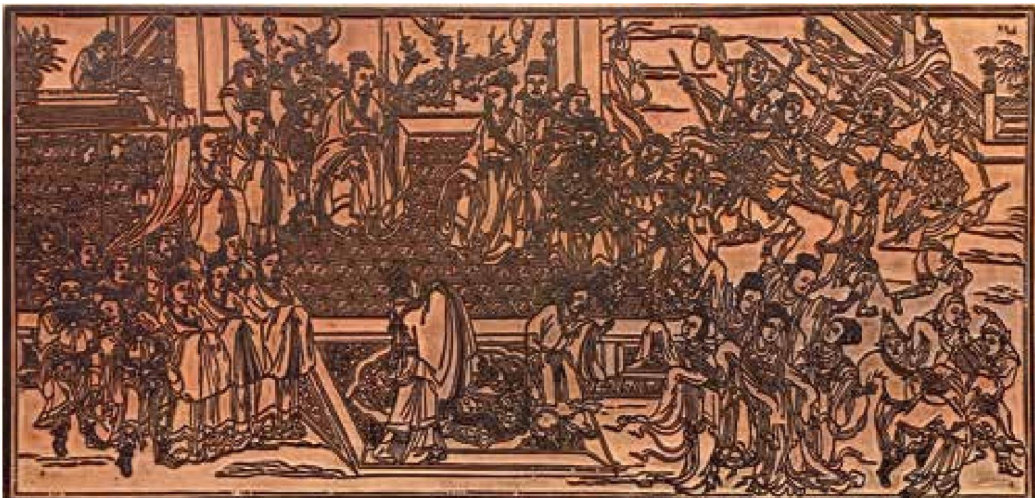 石桂利木刻的孔子圣迹图其中一块模版《夹谷会盟》用独板老梨木刻制