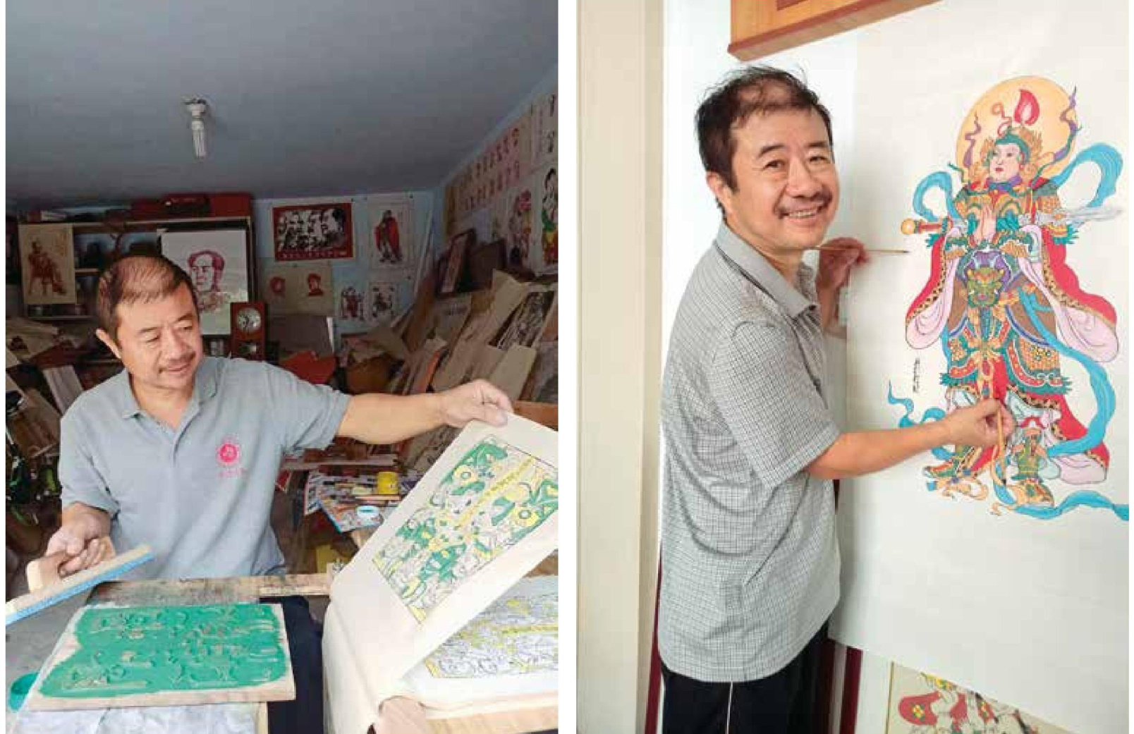 左:石桂利在印刷年画 右:石桂利在给年画作品补色