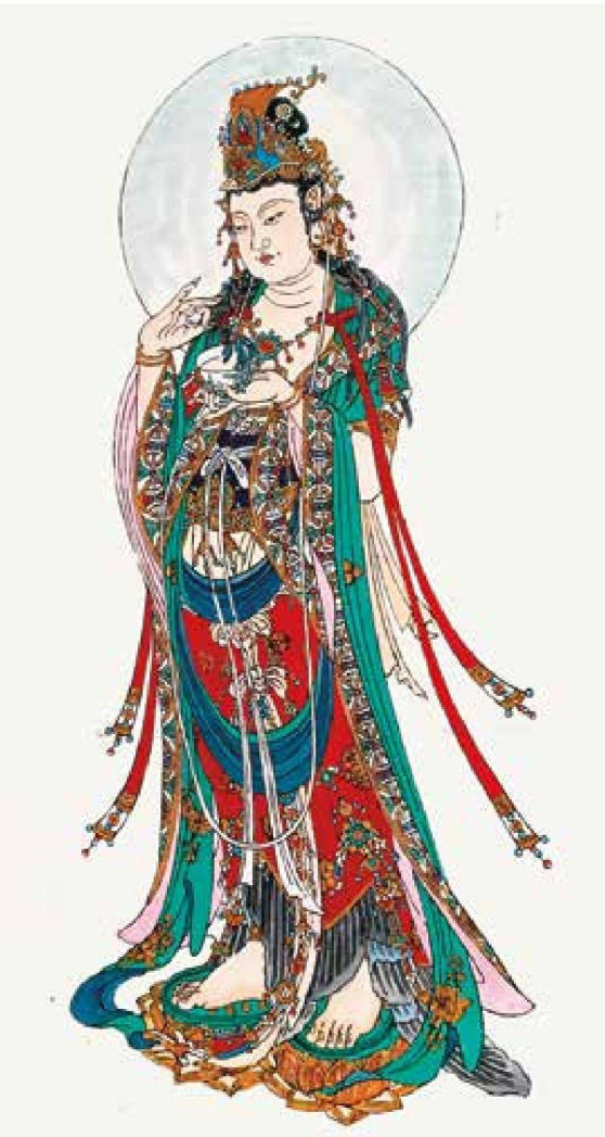 《观音菩萨》,高136cm,宽66cm,木刻线版,手工填色