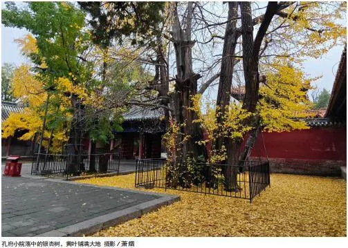 穿越孔庙前的神道广场,这里是银杏和松树的绝妙搭配。都一样地蓬勃饱满,松柏森森,银杏灿烂;两种色彩映衬,在凝重气氛中点燃了暮秋的诗情。树木后方的铺面多已歇业,游客相对稀少。同伴说,这两年经济不太景气,跟昔日人流密集的景象没法对比。前方就是曲阜古城墙。据说,炎帝、黄帝、少昊都曾在曲阜建都,商代在此也存在一个奄国。到西周分封诸侯,周公旦被分封到鲁地,就在这里建都。鲁国因为周公而成为礼乐之邦,都城显得更加神圣……这就是曲阜的渊源,追溯起来也有四五千年建都史,至少鲁国都城一直位居此地。眼前这座城并非鲁国故城,故城中心位于该城池东北,目前还在考古挖掘。明朝正德六年(1511年),河北刘六、刘七率领民军“破曲阜、焚官寺民居数百,县治为墟”。嘉靖年间,武宗朱厚照诏令山东巡抚于鲁故城西南隅以孔庙为中心重筑新城,即现存这座明故城。这在当时乃孔子故居所在地:阙里。
