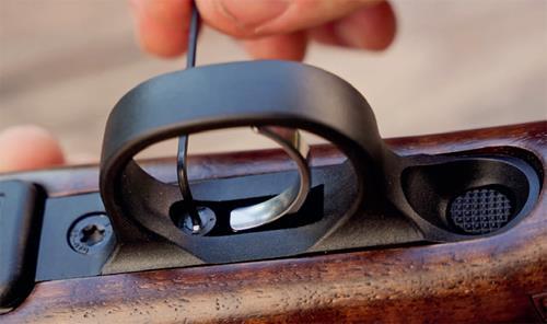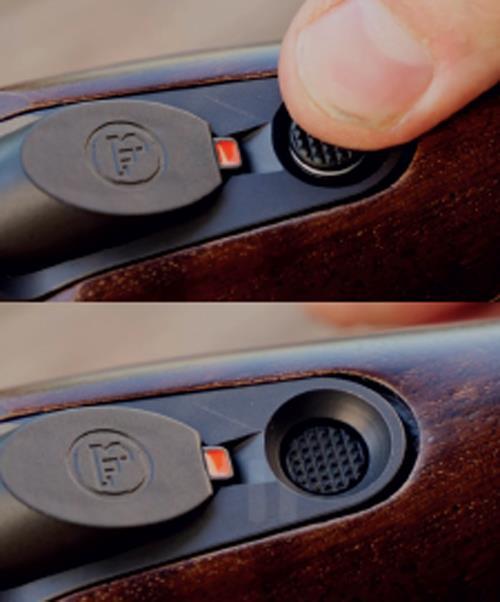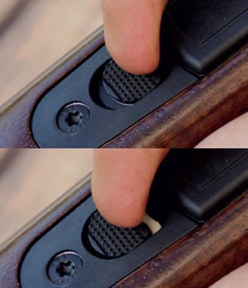 手动保险位于机匣尾部,向下贯通在扳机护圈后方。下按为射击位置,向上推动为保险位置。处于保险位置时,手动保险同时锁住扳机和枪机,保险按钮露出白色的提示环。