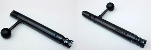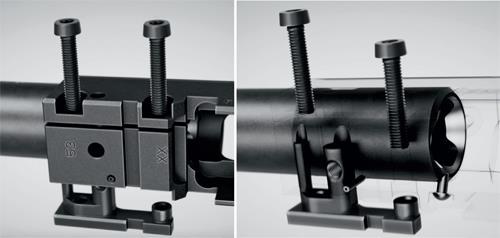 图为CZ600 Plus 步枪枪管的紧固方式,为便于观察,两张图中的实物均顺时针旋转了90°。改进后的CZ600 Plus 步枪在机匣内不再加工螺纹,而是采用螺栓加螺帽的紧固方式。螺帽兼作枪管定位销,枪管底部设有与螺帽配合的定位凹槽。同时机匣内增加枪管定位销,正确安装时定位销会卡入枪管底部的凹槽