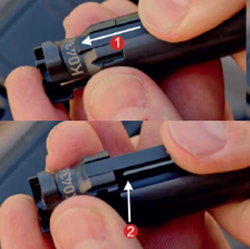 向前推动卡销1 ,以解除锁定,然后向上抬起枪机头 ,即可从枪机体上取下枪机头