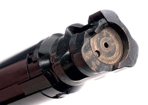 CZ600 Plus 步枪的枪机头特写。图中可见,卡销与抛壳挺位于一条直线上,卡销兼具驱动抛壳挺的功能,拉动枪机向后移动一定距离后,卡销向前推动抛壳挺突出弹底窝,抛出弹壳