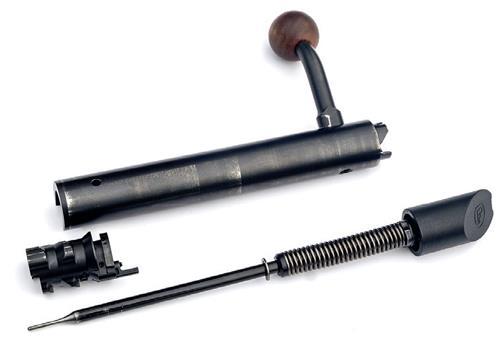 CZ600 Plus 沿用上一代CZ600 步枪使用的分体式枪机(图为CZ600 LUX 步枪枪机不完全分解),自上至下依次为:枪机体、枪机头、击针组件