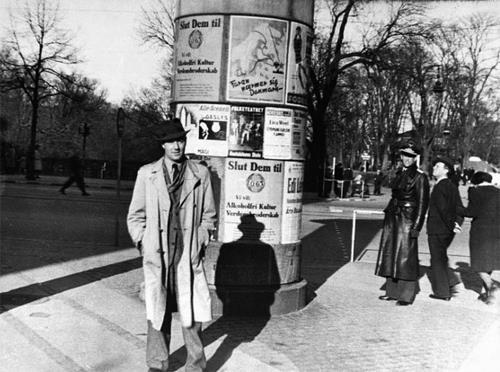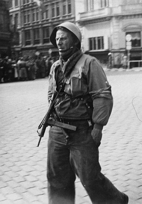 行走在街头的一名“丹麦旅”成员,头戴丹麦军用钢盔,手持司登Mk.Ⅱ冲锋枪,腰间斜插德国M1924木柄手榴弹,左臂上缠有红底白条、代表丹麦国旗的“丹尼布洛”臂章