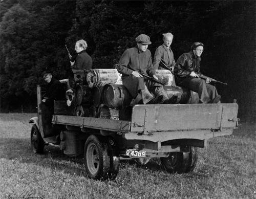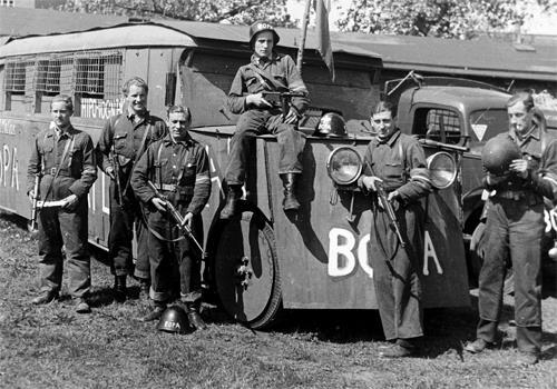 BOPA成立于1942年,是丹麦成立较早、规模较大的地下抵抗组织之一。图中大部分BOPA成员站在一辆自制装甲汽车前,手中枪支包括M1卡宾枪、M/37-39冲锋枪和司登Mk.Ⅱ冲锋枪
