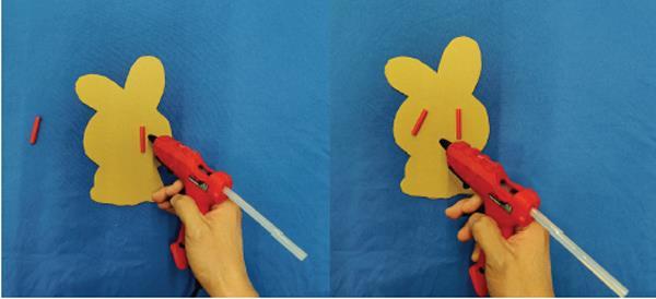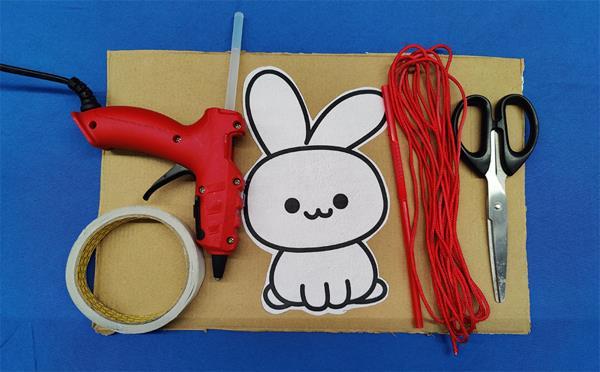 材料准备:热熔胶、吸管、剪刀、绳子、硬纸板、兔子图片、双面胶。