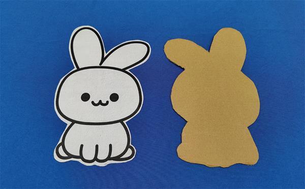 2. 用双面胶将兔子图片贴在硬纸板上,用剪刀沿着图片边沿将硬纸板剪出兔子图案。
