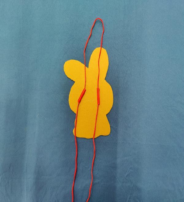 6. 让右侧绳子拉紧至竖直位置,左侧绳子松弛,如此交替反复,小兔子图案就自动上升了。