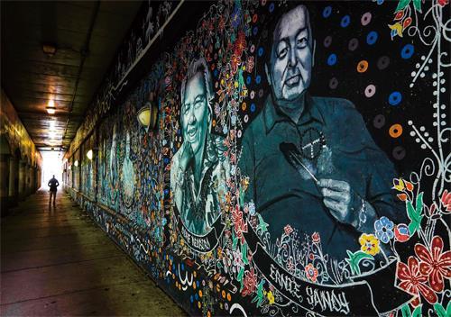 继续前行,从地下城最西端的大都会大厦回到地面,便是多伦多有名的娱乐区,也是游客扎堆的地方之一。街边遍布有特色的小酒馆、咖啡厅、艺术馆和画廊,以及街头艺术家的涂鸦作品。闲暇的周末可以来这里喝喝咖啡、看看展,晚上走进一家爱尔兰酒吧小酌一杯。与之遥相呼应的是老城东侧的古酿酒厂区。虽然不能从地下城直接到达,但可以通过地铁和TTC巴士无缝衔接。这里曾是大英帝国最大的酿酒厂所在地,如今被改造成类似北京798的创意园区,不定期举办各类市集和主题活动。