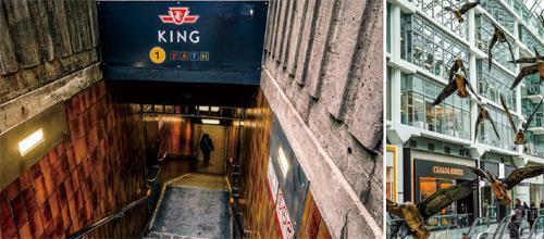 我是推开央街一扇不起眼的铁门,顺着狭窄昏暗的楼梯走入通道的:头顶是裸露的消防管道,空气中弥漫着刺鼻的消毒水气味,四周安静得令人毛骨悚然。千回百转,穿过几条灯光煞白的地下通道,就在我踌躇是否要继续时,角落再度出现了一扇标有PATH符号的铁门。我鼓起勇气推开后,映入眼帘的是往来不息的人潮——我来到了多伦多的地下世界!