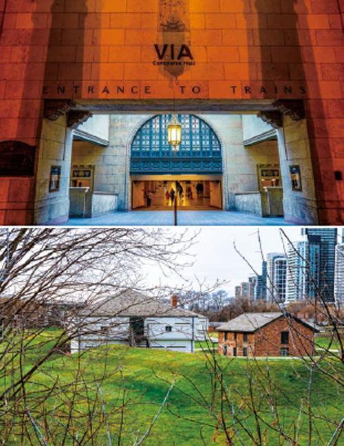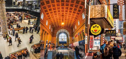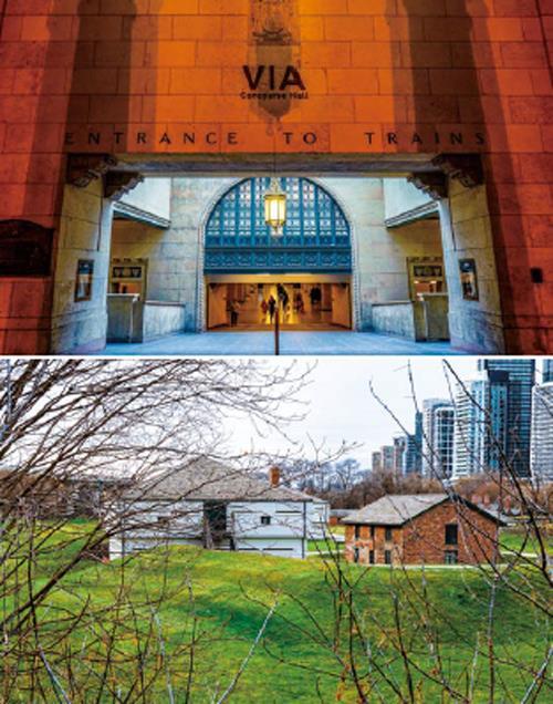 联合车站位于多伦多金融区南侧,是加拿大最繁忙的交通枢纽之一,每天有超20万人次搭乘GO和VIA列车往来渥太华、蒙特利尔、温尼伯、埃德蒙顿等各大城市。由“不爱江山爱美人”的爱德华八世亲自为车站揭幕,并卖出第一张前往阿尔伯塔的车票,此后联合车站就与纽约的中央车站一样,成为多伦多的地标性建筑,并见证了这座城市一个多世纪的荣辱兴衰。不论何时来到这里,你总能见到这样一幅繁忙的图景:过道里拖着行李箱的旅人熙来攘往,拥有数百张方桌的美食广场座无虚席,广场中央轮番播放广告的大屏幕前有DJ在打碟,与路人舞者随时配合一段即兴演出,空气中时刻飘荡着咖啡豆和肉桂的香味,这一切都与地面上那一百年前建成的冷峻石质建筑形成鲜明对比。
