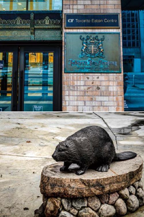走出伊顿中心,我看到墙上哈德逊湾公司的铜制标志:两头驼鹿举着一枚盾形徽章,中间被圣乔治十字架分割的四块区域内,各趴着一只海狸。时过境迁,海狸也从当年的猎杀对象变成了加拿大的宠儿,在城市的许多角落找到它的身影——雕塑、邮票乃至多伦多大学的校徽。我还尝到一种叫“海狸尾”的本地糕点,它形似海狸尾巴,是一种现炸的面饼,上面淋了一层加拿大特产的枫树糖浆,再撒上一把碎坚果,吃起来香甜酥脆。