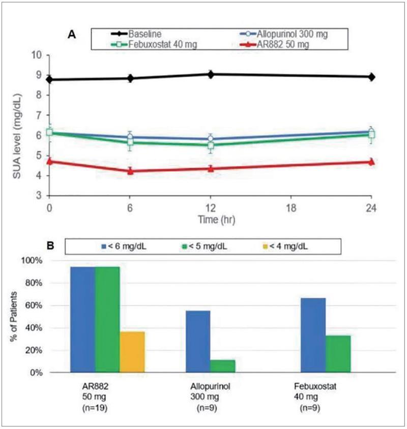 氘泊替诺雷的全球三期临床试验已接近完成,关键数据即将揭晓。图为氘泊替诺雷(AR882)痛风药物临床2a期数据