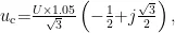以单条回路三相架空交流电输电线路为例,三相电导线水平排列,假设输电线路电压为 U ,计算电压取设计电压1.05倍,导线高度为 H ,相间间距为 L ,导线分裂数为 n ,分裂间距为 d ,子导线半径为 r 计算距地面 1.5m 处工频电场强度分布时,假设三相导线对地电压分别为 ua,ub,uc ,且三者满足大小相等、相位相差为 120∘ 的关系,则可表示为