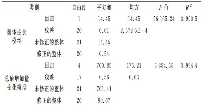 模型的相关系数 R2 仅是确定此模型是否适合菌体生长和总酚含量变化拟合的依据之一,为验证所建立的两个动力学模型的准确性,对试验期间测得的真实值和所建模型计算的理论值进行详细对比,结果见图5和图6。同时,为全面评估Logistic模型和Boltzmann模型的可靠性,对其进行了方差分析,结果见表2。
