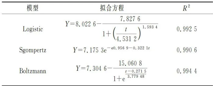 为了探究红枣汁在植物乳杆菌发酵期间总酚含量的变化,利用 Logistic、Sgompertz 和 Boltzmann 模型[28]对各时间点测得的总酚增加量进行非线性拟合,确定总酚含量变化的最佳动力学模型,3个模型拟合方程及其拟合系数 R2 见表1,总酚增加量用 Y 表示。