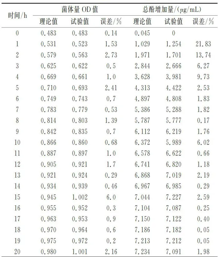 为探究菌体生物量和总酚含量在发酵过程中的变化趋势及其相关性,以 1h 为间隔点,对发酵红枣汁中菌体生物量和总酚含量进行测定,建立二者的动力学模型并进行验证,以此预测菌体生长状况及总酚含量在发酵过程中的变化。