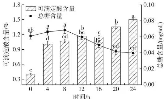 图2红枣汁发酵过程中可滴定酸含量和总糖含量变化 Fig.2 Changes of titratable acid content and total sugar contentofredjujubejuiceduringfermentation