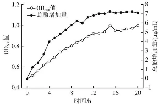 由图4可知, 0~12h 时植物乳杆菌在发酵枣汁中处于生长对数期,菌体繁殖速度快, 12h 后菌体繁殖速度逐渐减缓,而后趋于平稳,植物乳杆菌在发酵枣汁中的生长周期处于稳定期。同时,总酚含量的变化趋势与菌体生物量的变化趋势相一致。