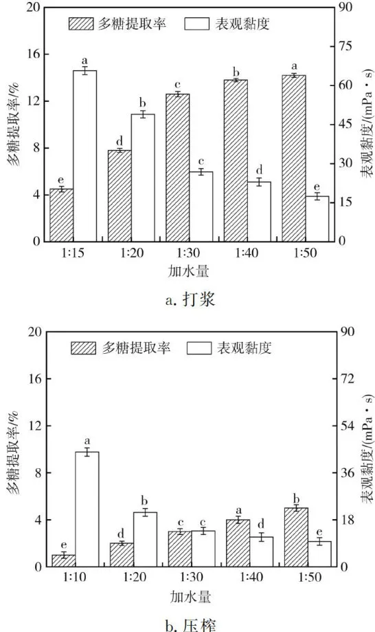 加水量是提取过程中的重要参数,它直接影响溶解平衡,进而影响多糖提取率和口感。加水量对铁皮石斛汁多糖提取率和表观黏度的影响结果见图3。