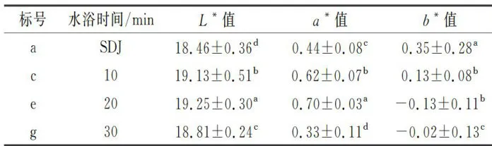 值和 b* 值的绝对值均先增大后减小,可能是水浴 20min 时铁皮石斛汁中的花色昔大量溶出,长时间低温水浴过程中,可溶性花色昔与氧气充分结合,发生水解或美拉德反应引起该物质结构改变。