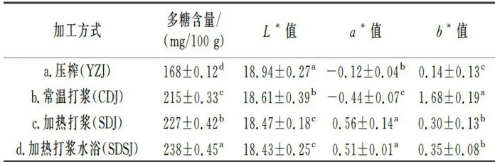 由表2可知,4种加工工艺对铁皮石斛汁的色泽和多糖含量均有显著性影响( Plt;0.05) 。YZJ的色泽为翠绿色, a* 值为一0.12,偏向绿色, b* 值为0.14,偏向黄色;CDJ的色泽为棕色, a* 值为 -0.44 ,偏向绿色, b* 值为1.68,偏向黄色;SDJ、SDSJ的色泽为紫色,该研究结果中 a* 值的变化与外观图结果一致,可能是由于加热处理促进了铁皮石斛叶鞘表皮的花色昔溶解于溶液中,增加了花色昔的溶出量。