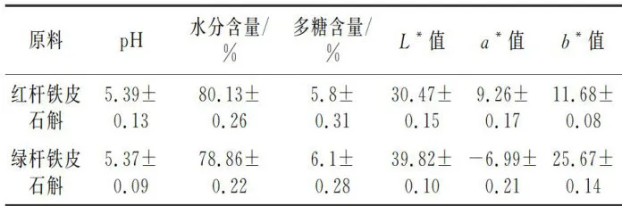 铁皮石斛按叶鞘表皮色泽分为红杆和绿杆铁皮石 斛。市面上常见的红杆铁皮石斛多为人工大棚种植的 杂交产物。铁皮石斛的基本理化指标见表1。