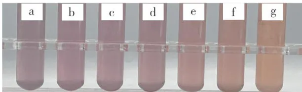 花色苷在水溶液中以2-苯基苯并吡喃阳离子、醌式碱、钾碱、查耳酮形式存在[19],不同 pH 条件下结构不同导致色泽不同,酸性越强,花色昔的稳定性越强。用柠檬酸调节铁皮石斛汁的 pH 分别为5.39(原汁),5,4.5,4,3.5,3,2.5,不同 pH 下铁皮石斛汁外观图见图10。不同 pH 对铁皮石斛汁色泽的影响见表8。