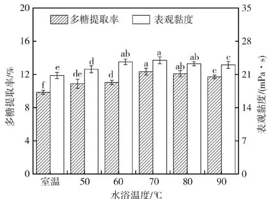 多糖分子易溶于水,适当升高温度有利于多糖的溶出。但温度过高会破坏多糖分子的内部空间缠绕结构,使其分解成短链。水浴温度对铁皮石斛汁多糖提取率和表观黏度的影响结果见图4。