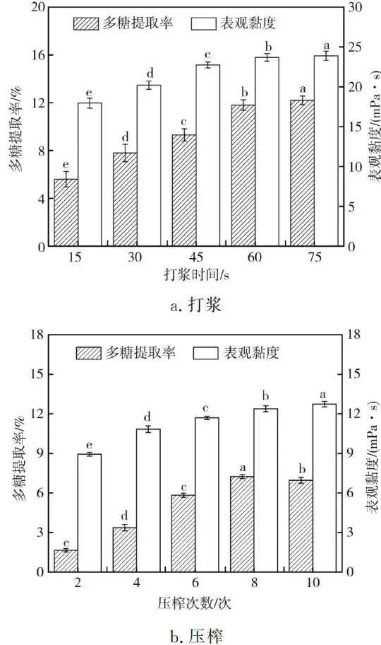 传统的打浆方式破碎率高,得到的多糖含量高,但小分子酚类物质、粗纤维和叶绿素等不溶性物质容易造成浑浊和沉淀问题。压榨方式通过物理挤压使营养成分的损失率低、澄清度高,但多糖含量少。以新鲜铁皮石斛为原料,打浆工艺的加水量为 ζ1:ζ30 ,打浆时间分别为 15,30,45,60,75s ,过60自筛收集滤液。压榨工艺的加水量为 1:30 ,压榨次数分别为2,4,6,8,10次,压榨前铁皮石斛渣浸泡 6min ,过60目筛收集滤液。不同取汁方式对铁皮石斛汁多糖提取率和表观黏度的影响结果见图2。