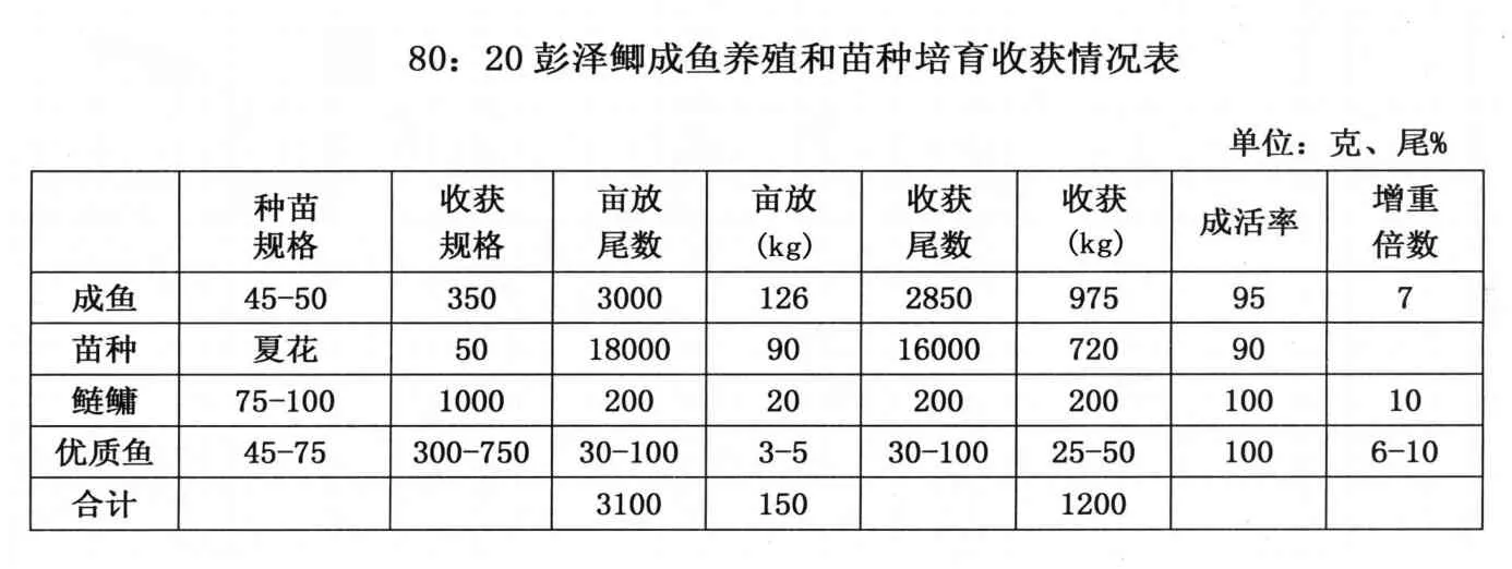 ②放养模式。试验证明,最具经济效益的模式是池塘“80:20”模式,即收获时,吃食性主养鱼类占80%,肥水滤食性鱼类占 20%的比例放养(彭泽鲫鱼 79%,搭配肉食性鱼类鳜、黑鱼、鲶、黄颡鱼 1%,鲢、鳙鱼占 20%)。