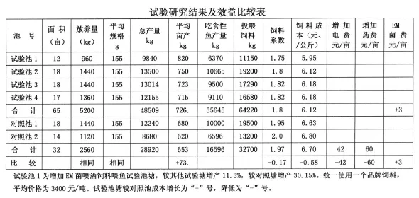 试验池 1为增加 EM菌喷洒饲料喂鱼试验池塘,较其他试验塘增产 11.3%,较对照塘增产30.15%。统一使用一个品牌饲料,平均价格为 3400元/吨。试验池塘较对照池成本增长为“+”:号,降低为“-”号。