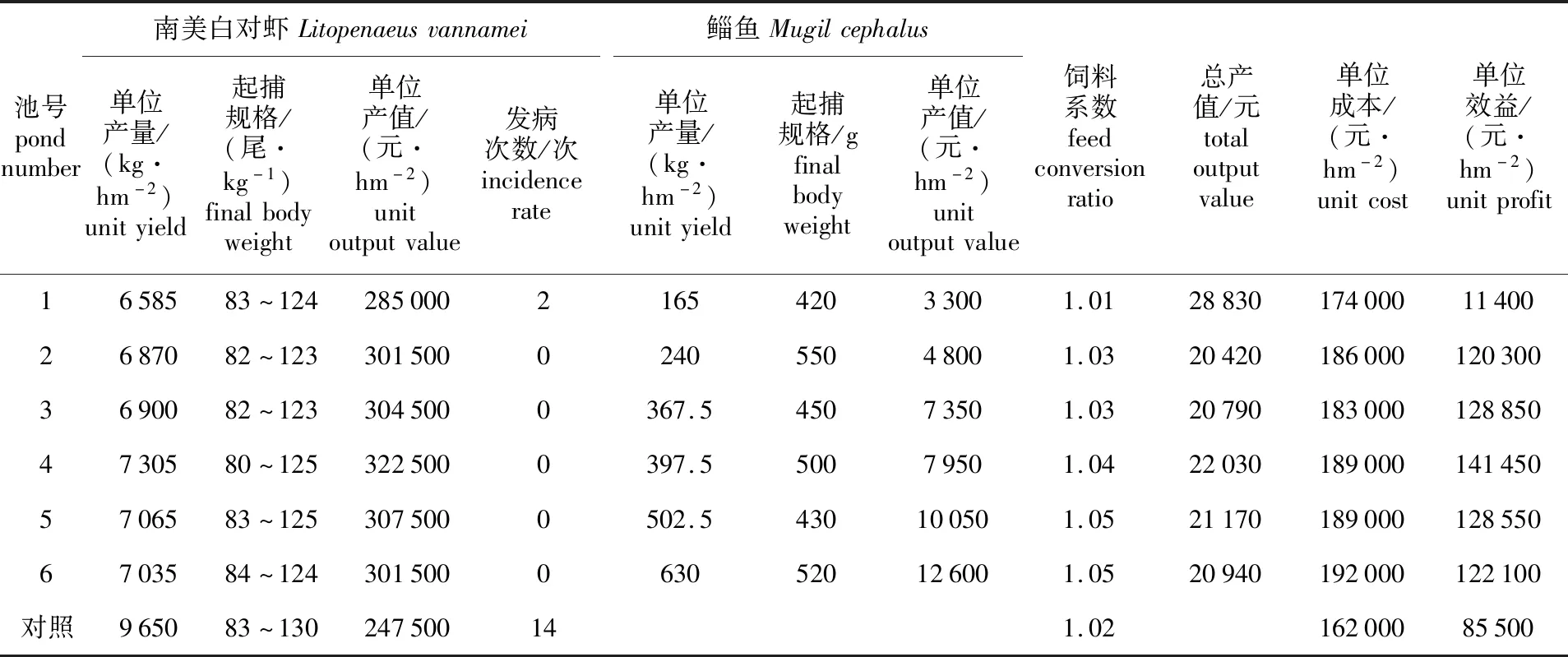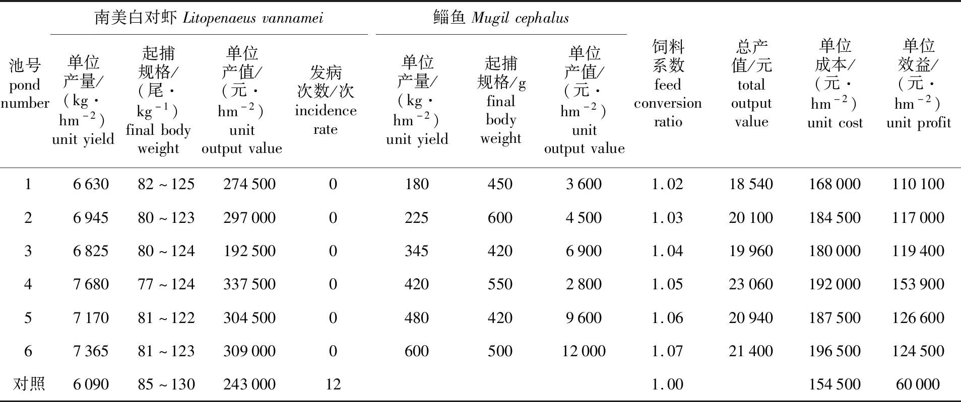 混养鲻鱼放养规格为48~80 g/尾,放养密度为75~225尾/hm2,收获鲻鱼规格为420~520 g/尾。