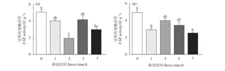干露实验前后,香港牡蛎肝胰腺中CAT活性有显著差异,即干露初期 (0 d) 与干露后期 (7 d) 相比显著下降 (P<0.05)。25 ℃干露第3天,CAT活性显著低于干露第0和第5天 (P<0.05,图4-a)。温度为4 ℃,随着干露时间持续,CAT活性有显著差异 (图4-b)。香港牡蛎肝胰腺中CAT活性在第1和第7天时显著低于干露初期 (P<0.05),在第3天,与干露第7天相比CAT活性又有显著上升(P<0.05)。