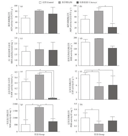ACP、SOD活性及MDA含量在2种免疫刺激过程中均无显著变化 (图3)。LPS组的AKP活性显著高于哈维弧菌组 (P<0.05,图3-b)。哈维弧菌免疫感染组T-AOC活性显著低于对照组和LPS组(P<0.05,图3-e),LPS组NOS活性显著高于对照组和哈维弧菌组 (P<0.05,图3-g)。此外,2种免疫刺激均显著降低了香港牡蛎肝胰腺组织中CAT活性 (P<0.05,图3-f)。对照组POD活性均高于2个实验组,且显著高于LPS组 (P<0.05,图3-h)。