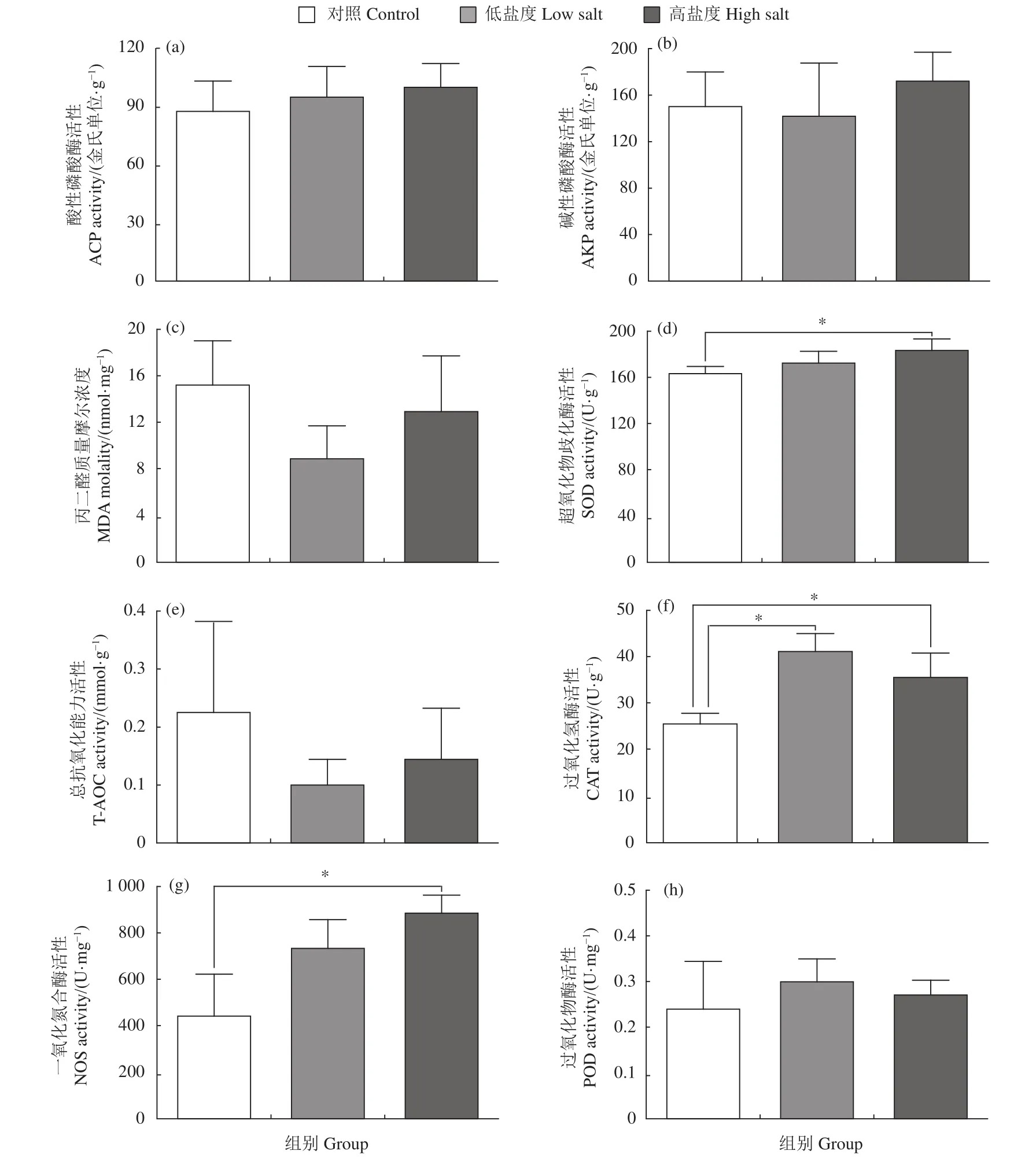 在不同盐度的环境中,香港牡蛎肝胰腺中ACP、AKP、T-AOC和POD活性及MDA含量均无显著变化 (P>0.05,图2)。在高盐度胁迫下,SOD活性显著高于对照组 (P<0.05,图2-d),高盐度也显著诱导NOS活性上升 (P<0.05,图2-g)。与其他酶活相比,无论是在低盐度还是高盐度中,实验组CAT活性均显著高于对照组 (P<0.05,图2-f)。